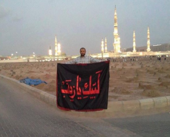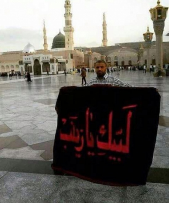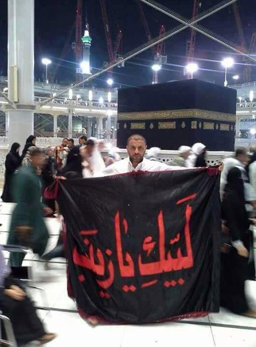 وتبين احدى الصور هذا الرجل وهو يقف في ساحة الحرم وهو يرفع راية تحمل شعار "لبيك يا زينب", حيث تعتبر هذه العبارة احدى شعارات الشيعة المتعارف عليها .