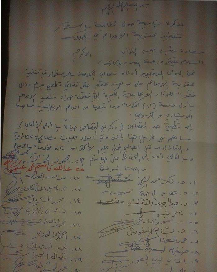 وثيقة : مذكرة نيابية تطالب بالاستمرار بتنفيذ عقوبة الاعدام