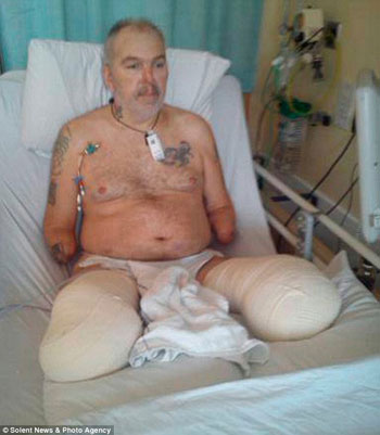 وكشفت الفحوصات أن عامل البناء البريطانى أصيب بميكروب خطير ونادر، تسبب فى تحول بشرة ساقيه وذراعيه للون الأسود، وساءت حالته بشدة وتوقع الأطباء أنه من المتوقع أن يموت قريبًا لأن مرضه كان يتدهور بشكل مخيف. واضطر الأطباء إلى بتر أطرافه الأربعة كى ينقذوه من توغل وانتشار المرض الغامض بجميع أنحاء جسمه، وظل قعيد الفراش لمدة 3 سنوات كاملة، تعرض خلالها للموت أكثر من 4 مرات، وخضع لأكثر من 26 عملية.