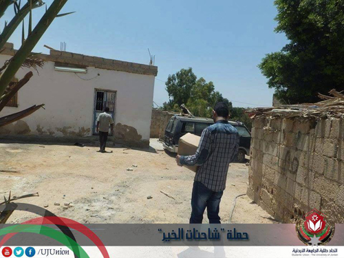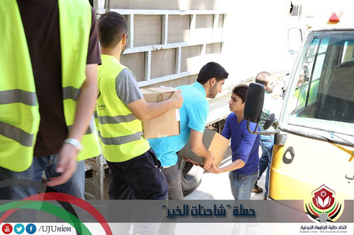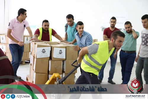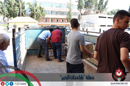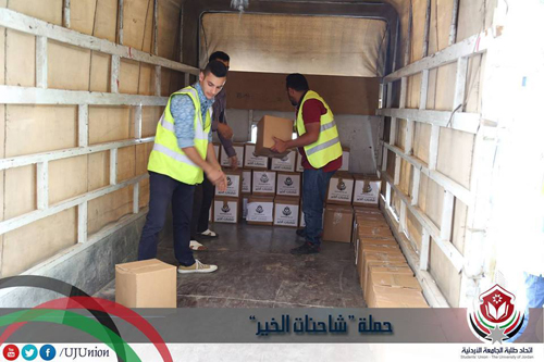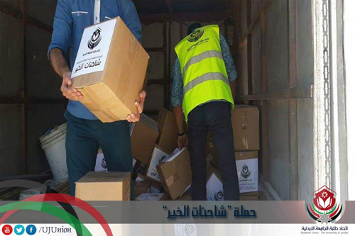 المدينة نيوز - : أطلق اتحاد طلبة الجامعة الأردنية أمس الأربعاء قافلة "شاحنات الخير" التي نظمها خلال الأسبوع الماضي لتوزيع الطرود الغذائية للقرى والمخيمات المحتاجة في شمال و وسط وجنوب المملكة .
