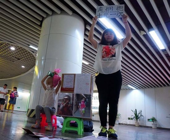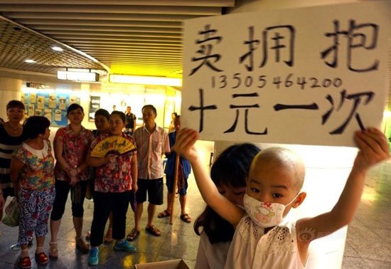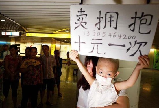 المدينة نيوز:- فى محاولة يائسة لجمع تكاليف علاج ابنتها المصابة بسرطان الدم، وقفت الأم الصينية "تشن ديجان" البالغة من العمر 28 عامًا فى محطة المترو المزدحمة "تشوشنغتينغ" يومى الجمعة والسبت الماضيين حاملة لافتة من الورق المقوى مكتوب عليها "حضن للبيع.. 10 يوان لكل واحد"، وإلى جوارها جلست ابنتها المريضة، البالغة من العمر 4 سنوات مع جهاز تنفس صناعى وكانت صلعاء تقريبًا.