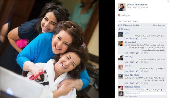 وظهرت دنيا سمير غانم بدون "ميك أب" فى الصورة التى جمعتها بشقيقتها ووالدتها، فيما شارك متابعى صفحتها على "فيس بوك" بتعليقات الاعجاب بهذا التجمع العائلى.