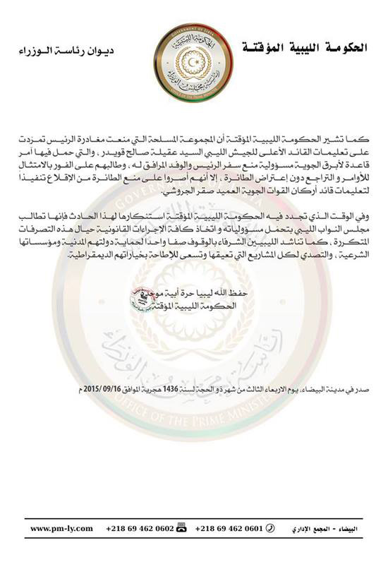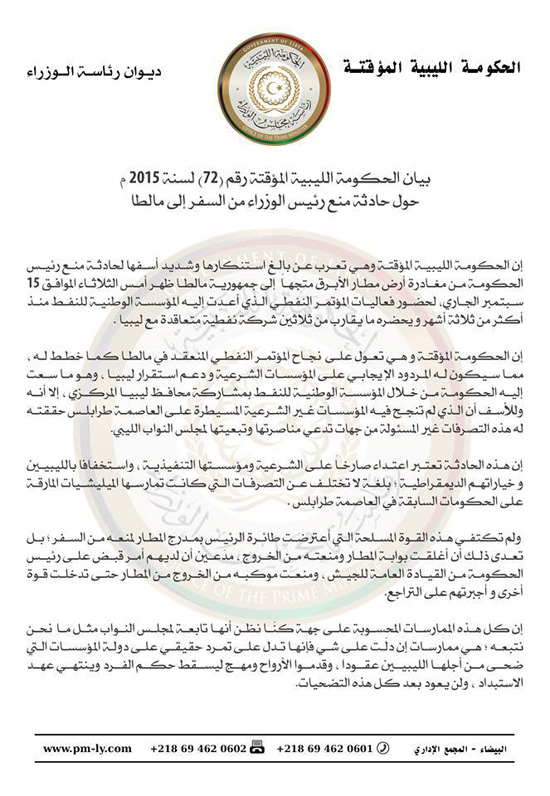 وأضاف البيان : " أن مجموعة مسلحة ادعت تبعيتها للقيادة العامة للجيش الليبي بقيادة الفريق أول خليفة حفتر، منعت رئيس الحكومة السيد عبد الله الثني من السفر إلى مالطا عبر مطار لأبرق، ظهر الثلاثاء، لحضور فعاليات المؤتمر النفطي، الذي أعدت له المؤسسة الوطنية للنفط الليبية منذ ثلاثة أشهر، بمشاركة أكثر من ثلاثين شركة نفطية متعاقدة مع ليبيا".