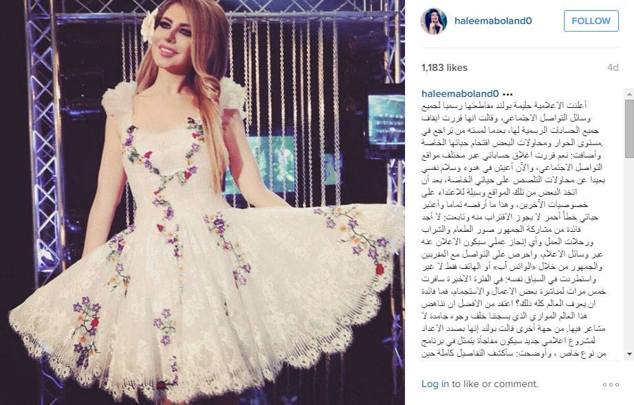 نشر المسؤول بياناً كتبه المكتب الإعلامي الخاص ببولند عبر موقع الـ Instagram، جاء فيه: “أعلنت الاعلامية حليمة بولند مقاطعتها رسميا لجميع وسائل التواصل الاجتماعي، وقالت انها قررت ايقاف جميع الحسابات الرسمية لها، بعدما لمسته من تراجع في مستوى الحوار ومحاولات البعض اقتحام حياتها الخاصة”.