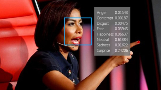 صورة الفنانة شيرين عبد النور خلال احدى حلقات "ذا فويس" بعدما سألت مشتركة من فريقها إن كانت قد ظلمتها باختيار أغنية، فجاءت تحليلات التطبيق عن مشاعرها كالتالي: الغضب: 0.01543، الامتعاض: 0.00187، الاستعلاء: 0.00475، السعادة: 0.06637، حيادي: 0.61384، الحزن: 0.01622، الدهشة: 0.24206.