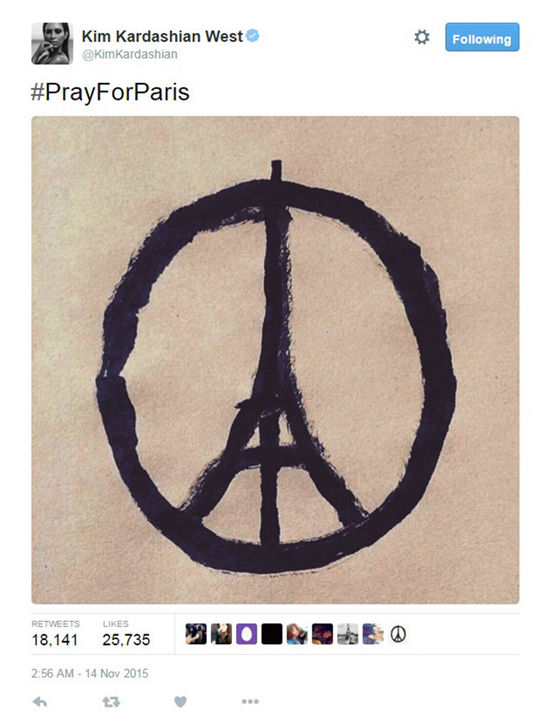 قالت عبر حسابها الشخصي على موقع تويتر "صلوا من اجل باريس" مرفقة برسم اسود لبرج ايفل.
