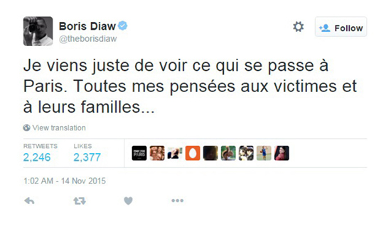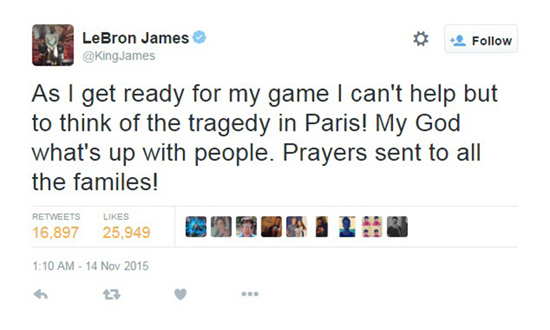 عرض صورة لبرج "امباير ستايت بيلدينغ" الذي اضيء بالوان العلم لفرنسي مرفقا بالرسالة التالية"اصلي من اجل باريس. انا اتابع الاخبار. اتعاطف مع العائلات واصدقاء الضحايا وكل المتواجدين في باريس وفرنسا هذا المساء. ابقوا في امان في منازلكم".