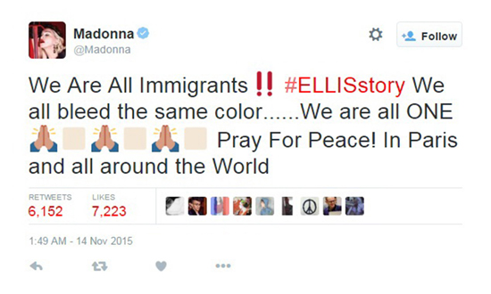 غردت عبر حسابها على موقع تويتر بقولها "نحن كلنا مهاجرون. ننزف الدم نفسه. كلنا موحدون. صلوا من اجل السلام. في باريس والعالم باسره".