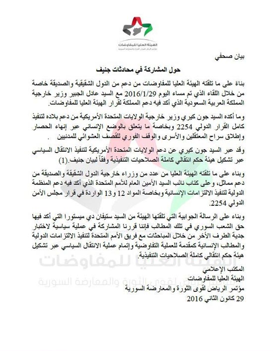 بناءً على ما تلقته الهيئة العليا للمفاوضات من دعم من الدول الشقيقية والصديقة خاصة من خلال اللقاء الذي تم مساء اليوم 29/1/2016 مع السيد عادل الجبير وزير خارجية المملكة العربية السعودية الذي أكد فيه دعم المملكة لقرار الهيئة العليا للمفاوضات.