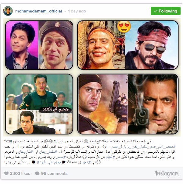 وأضاف: “علي العموم انا لسه بالصدفة شايف هاشتاج اسمه #محمد_امام_ادعو_سلمان_خان_لزيارة_مصر .. اول مره اشوفه، و اتخضيت من عدد الناس الكتير اللي استخدموه !... واحب أقول للمهتم بالموضوع إن انا حبتدي من دلوقتي أعمل محاولات و إتصالات للوصول لسلمان_خان او شاروخان و ادعوهم فعلاً لزيارة مصر و ربنا يقدرني ، بس المهم هما يرضوا و علي فكرة احنا معانا ممثلين هنود كتير في الفيلم بس كل حاجة حتظهر في وقتها “.