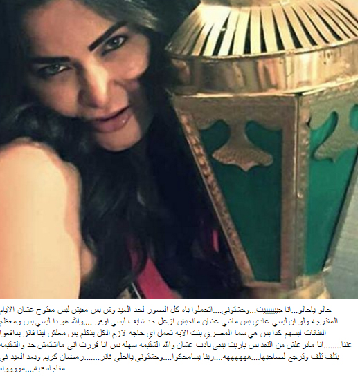 المصري نشرت صورة لها بجانب فانوس رمضان، عبر حسابها الشخصي على إنستغرام، معلقة عليها بالقول: "كل الصور لحد العيد وش بس مفيش لبس مفتوح عشان الايام المفترجه ولو ان لبسي عادي بس ماشي عشان مااحبش ازعل حد شايف لبسي اوفر."