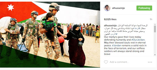 وقال الامير الحسين عبر حسابه على موقع "انستغرام": "الرحمة لشهداء قواتنا المسلحة البواسل. سيظل أردننا قويا بأبنائه وبناته في وجه كل عدوان، وسيبقى جيشنا العربي حاملا للأمانة مدافعا عن ثرى الأردن الطهور".