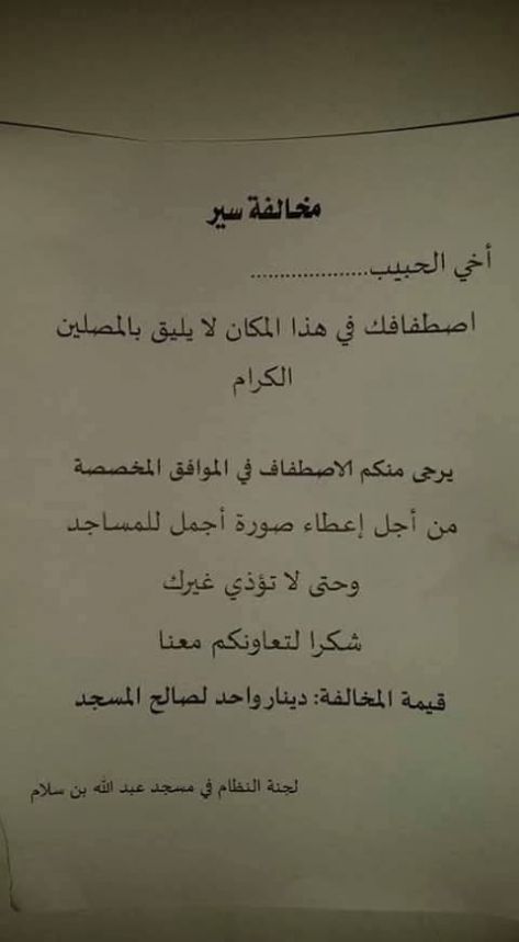 وجاء في نص "المخالفة": "أخي الحبيب، اصطفافك في هذا المكان لا يليق بالمصلين الكرام، يرجى منكم الاصطفاف في الأماكن المخصصة لإعطاء صورة أجمل للمساجد وحتى لا تؤذي غيرك، شكرا لتعاونكم معنا".