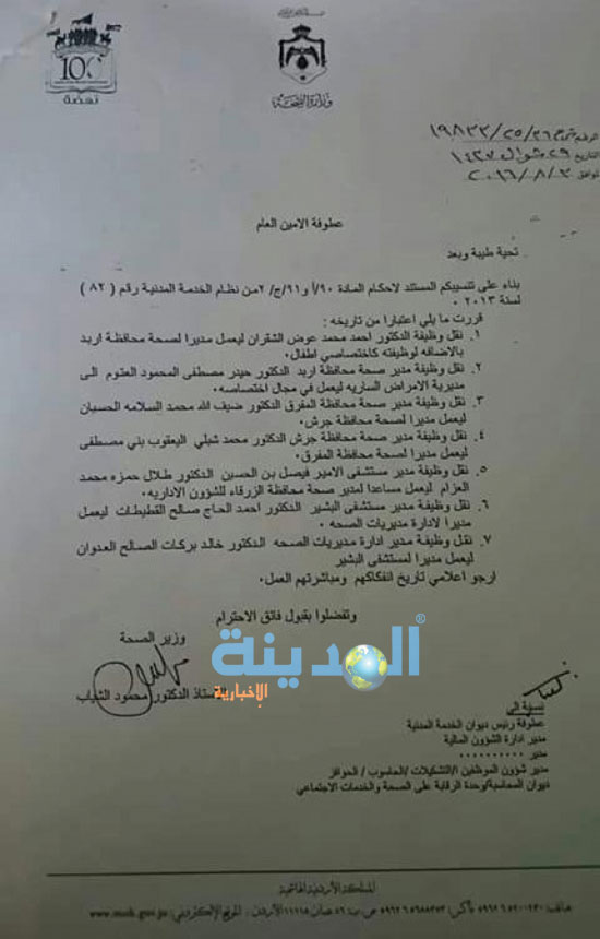 تنقلات في وزارة الصحة والشقران مديراً لصحة إربد ( وثيقه )