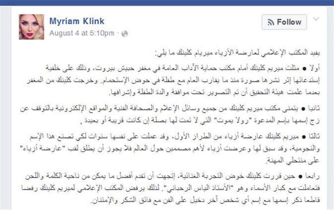أولا ● مثلت ميريم كلينك أمام مكتب حماية الآداب العامة في مغفر حبيش بيروت، وذلك على خلفية إستدعائها إثر نشرها صورة منذ ما يقارب العام مع طفلة في حوض الإستحمام. وخرجت كلينك من المغفر بعدما علمت هيئة التحقيق أن تم التصوير تحت موافقة والدة الطفلة وإشرافها.