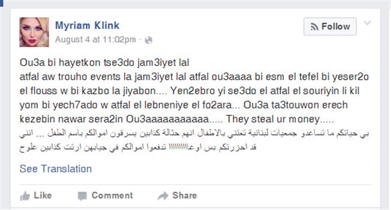 "أوعى بحياتكن تساعدوا جمعيات للأطفال أو تروحوا مناسبات لجمعيات الأطفال.. أوعى بإسم الطفل بيسرقوا الفلوس وبيكذبوا لجيابهن.. ينقبروا يساعدوا الأطفال السوريين الي كل يوم بيشحدوا والأطفال اللبنانية الفقراء.. أوعى تعطوهن قرش كذابين نور سراقين .. بيسرقوا أموالكن".