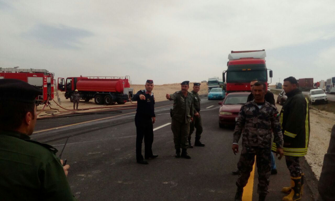 المدينة نيوز :- ذكرت إدارة الإعلام في الدفاع المدني بان كوادر الإطفاء والإسعاف في مديرية دفاع مدني الكرك تعاملت ظهر اليوم مع حادث تصادم وقع بين صهريجين احدهما محمل بمادة الديزل والآخر محمل بالغاز المسال بمنطقة سواقة نتج عن الحادث إصابة شخص بجروح ورضوض في مختلف إنحاء الجسم كما نتج عنه أيضا احتراق غرفة السائق في صهريج الديزل.