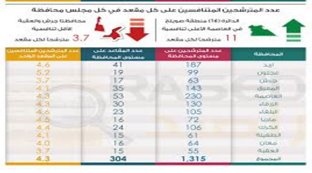 وأظهر تقرير راصد أن مؤشر التنافسية على المقعد الواحد لجميع المترشحين في الممملكة بلغ 4.3 مترشحاً ومترشحة يتنافسون على المقعد الواحد على مستوى المملكة أما على صعيد تنافسية المقعد في كل محافظة، أي بما معناه عدد المترشحين الذين يتنافسون على كل مقعد في مجلس المحافظة فيتبين أن أعلى محافظة سجّلت أكبر تنافسية على المقعد الواحد هي محافظة عجلون حيث وصل عدد الذين يتنافسون على المقعد الواحد الخاص بمجلس المحافظة إلى 5.2 مترشحاً ومترشحة لكل مقعد، تلتها محافظة البلقاء بعدد وصل إلى 4.6 مترشحاً ومترشحة يتنافسون على المقعد الواحد، فيما كانت محافظة جرش والعقبة الأقل تنافسية، بعدد وصل إلى 3.7 مترشحاً ومترشحة لكل مقعد.