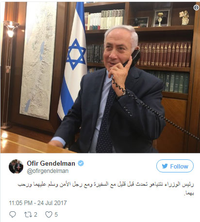 فيما تضمنت إحدى التغريدات صورة لرئيس الحكومة الإسرائيلية بنيامين نتنياهو مبتسما وهو يتحدث مع السفيرة الإسرائيلية لدى عمان عينات شلاين وحارس السفارة فور عودتهما إلى تل أبيب.
