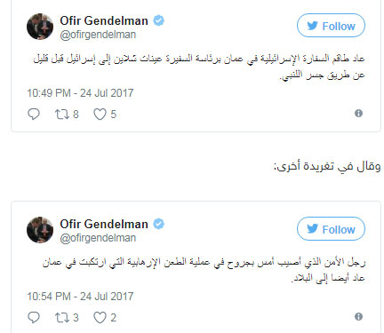 المدينة نيوز :- نشر الناطق باسم الحكومة الإسرائيلية عوفير جندلمان سلسلة من التغريدات يعلن فيها عودة طاقم السفارة الاسرائيلية لدى عمان إلى تل أبيب ومن بينهم قاتل الاردنيين.