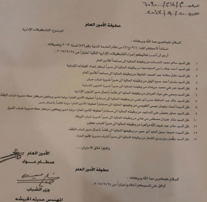 المدينة نيوز :- قرر وزير الشباب المهندس حديثه الخريشه إجراء تشكيلات في وزارته على النحو التالي :