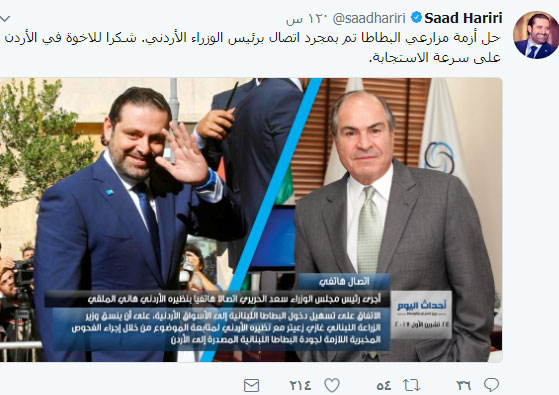 المدينة نيوز :- اكد رئيس الوزراء اللبناني سعد الحريري على حل أزمة مزارعي البطاطا مع الاردن .