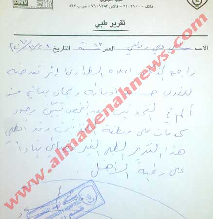 المدينة نيوز - خاص -: اشتكى ذوو الطالب سامي علي الرفاعي من أن ابنهم تعرض لضرب مبرح بــ " البربيش " من قبل أحد المعلمين ، و يقولون : ان الطالب استأذن في الخروج من معلمه في الصف و أثناء ذهابه لقضاء حاجته واجهه المعلم المناوب الذي لم يقتنع بأن الطالب مأذون فانهال عليه جلدا بالبربيش ، مما دعا ذويه الى الحصول على هذا التقرير الطبي غير القضائي كمقدمة لتقديم شكوى رسمية .