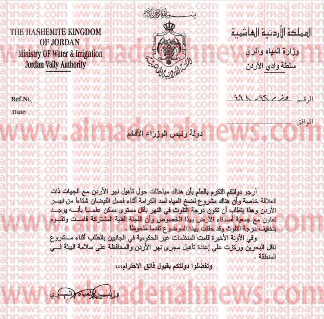 المدينة نيوز – خاص وحصري – وثائق : حصلت المدينة نيوز على إحدى المخاطبات الرسمية المتعلقة بتلويث إسرائيل لنهر الأردن بمياه المجاري ، وهي القضية التي عانينا منها العام الفائت وتعطل الضخ خلالها إلى زيزيا وعمان وذاق الاردنيون منها الأمرين .