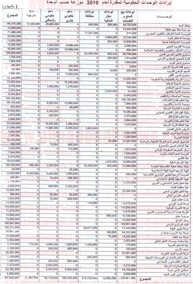 نترك لكم مطالعة الجدول الذي يبين الإيرادات المقدرة في العام 2010 ، ومطلوب من النواب نبش هذه القصة التي يبدو أنها ستصدع رؤوسنا كل عام ، رغم أنه تم دمج بعض الوحدات وإلغاء أخرى ..