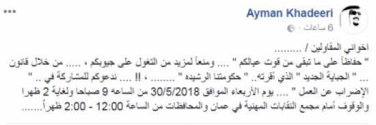 وقال الخضيري " اخواني المقاولين ؛ حفاظآ على ما تبقى من قوت عيالكم ،ومنعآ لمزيد من التغول على جيوبكم ،من خلال قانون الجباية الجديد الذي أقرته حكومتنا الرشيده ندعوكم للمشاركة في الإضراب عن العمل ".