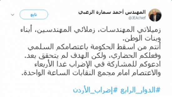 المدينة نيوز:- دعا نقيب المهندسيين المهندس أحمد الزعبي، اليوم الثلاثاء، كافة منتسبي النقابة إلى الاضراب غداً الأربعاء.