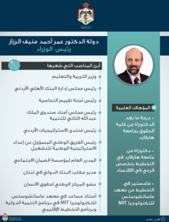 المدينة نيوز:- كلف الملك عبدالله الثاني رسمياً، اليوم الثلاثاء، الدكتور عمر الرزاز بتشكيل الحكومة الجديدة خلفاً للدكتور هاني الملقي.
