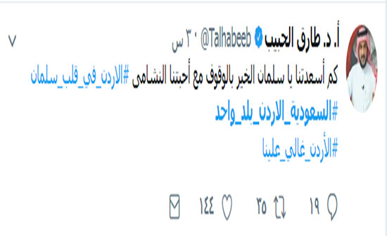 وكان من أبرز الشخصيات التي غردت على ضمنه ، عالم النفس المعروف الدكتور طارق الحبيب؛ فقال " كم أسعدتنا يا سلمان الخير بالوقوف مع أحبتنا النشامى #الاردن_في_قلب_سلمان".