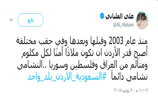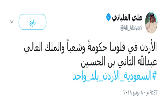 وأضاف العلياني في تغريدة أخرى، " الأردن في قلوبنا حكومةً وشعباً والملك الغالي عبدالله الثاني بن الحسين".