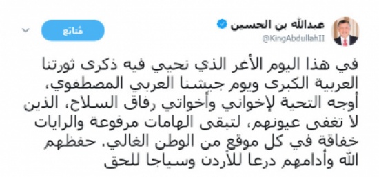 وغرد الملك عبر حسابه على تويتر، "في هذا اليوم الأغر الذي نحيي فيه ذكرى ثورتنا العربية الكبرى ويوم جيشنا العربي المصطفوي، أوجه التحية لإخواني وأخواتي رفاق السلاح، الذين لا تغفى عيونهم، لتبقى الهامات مرفوعة والرايات خفاقة في كل موقع من الوطن الغالي. حفظهم الله وأدامهم درعا للأردن وسياجا للحق".
