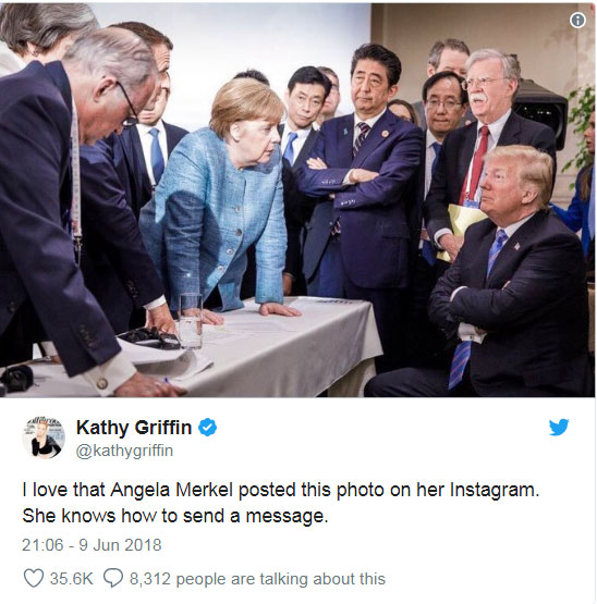 ووصفت وسائل إعلام غربية، الصورة التي نشرتها ميركل، بأنها الأكثر إثارة في مؤتمر الدول السبع.