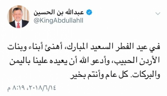 المدينة نيوز :- هنأ جلالة الملك عبدالله الثاني الأمة بعيد الفطر السعيد، عبر حسابه على موقع التواصل الاجتماعي "تويتر"، وقال جلالته: "في عيد الفطر السعيد المبارك، أهنئ أبناء وبنات الأردن الحبيب، وأدعو الله أن يعيده علينا باليمن والبركات. كل عام وأنتم بخير".