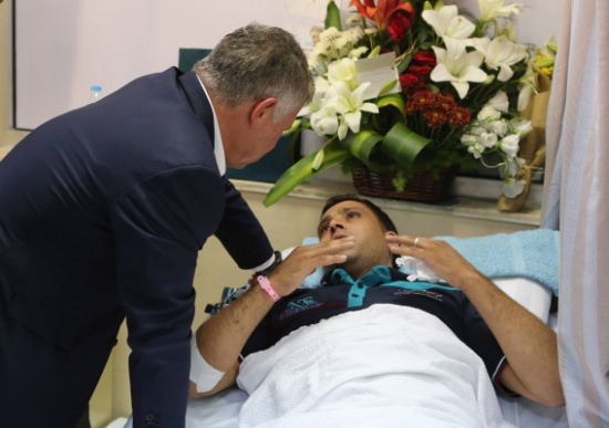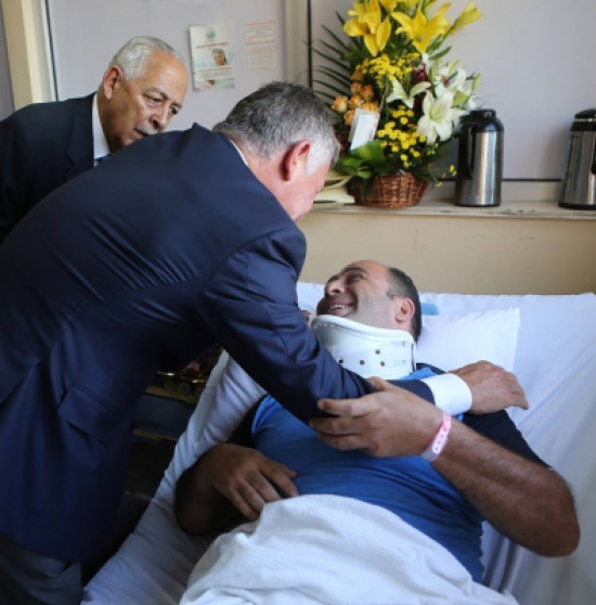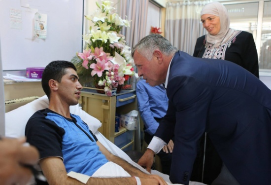 واستمع جلالة الملك، من مدير عام الخدمات الطبية الملكية اللواء الطبيب معين الحباشنة والفريق الطبي المشرف، إلى شرح عن الحالة الصحية للمصابين والعناية الطبية التي يتلقونها.