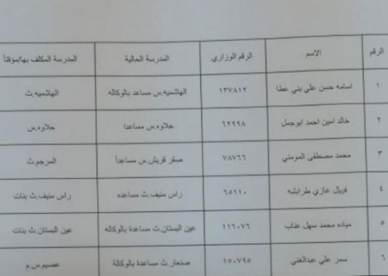 المدينة نيوز: اصدرت وزارة التربية والعليم قرارا يقضي بتكليف كل من المذكورين في الجدول المرفق بالقيام بمهام مدير المردسة المبينة ازاء اسم كل منهم :