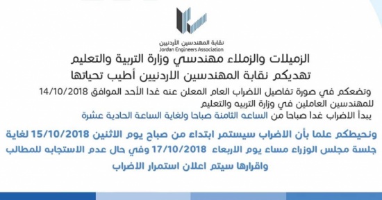 المدينة نيوز :- دعت نقابة المهندسين منتسبيها في وزارة التربية والتعليم المشاركة في اضراب المهندسين يوم الاثنين .