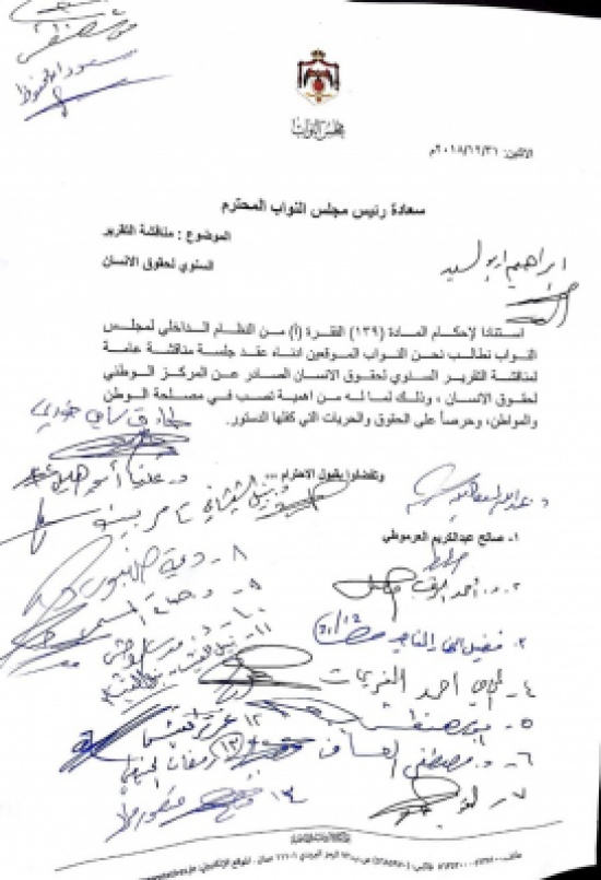 وقالت المذكرة التي تبناها النائب المحامي صالح العرموطي ان توقيع المذكرة جاء حرصا على حقوق الانسان .
