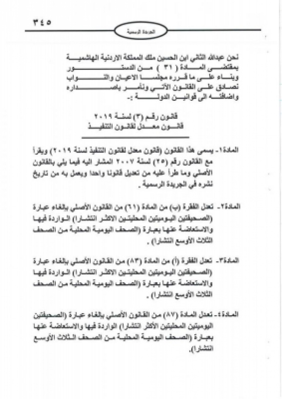 المدينة نيوز:- دخل قانون معدل لقانون اصول المحاكمات المدنية (قانون رقم 4 لسنة 2019 ، الثلاثاء ، وذلك بعد صدور الارادة الملكية بالموفقه عليه و نشره في الجريدة الرسمية .