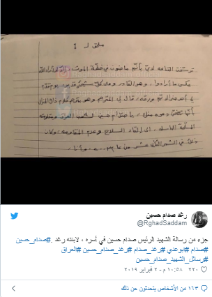 ونشرت رغد عبر حساب منسوب لها، على "تويتر" صورة لجزء من رسالة والدها وأرفقتها بعبارة: "جزء من رسالة الشهيد الرئيس صدام حسين في أسره لابنته رغد".