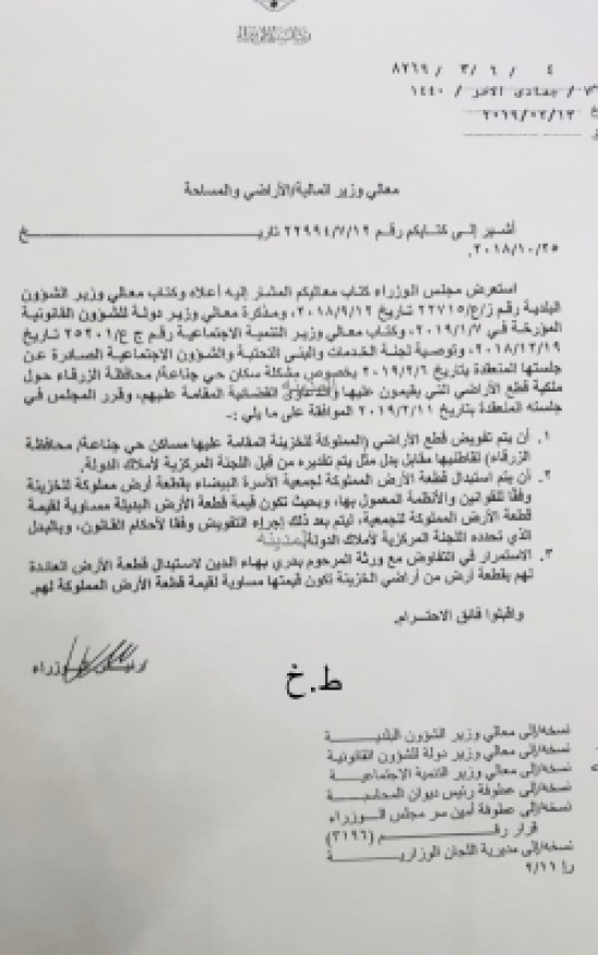 المدينة نيوز : وافق مجلس الوزراء على تفويض اراضي حي جناعة بالزرقاء لساكنيها .