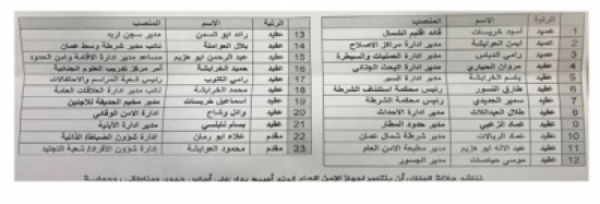 وتثبت القائمة المتداولة والمكونة من 119 قيادياً توزيع المناصب والمواقع في مديرية الأمن العام من مختلف المناطق، وعدم وجود احتكار لمنطقة بعينها على المواقع العليا في الجهاز.
