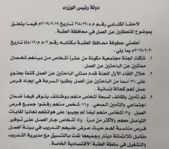 مبيضين للرزاز: تم تشغيل كافة المتعطلين عن عمل في العقبة