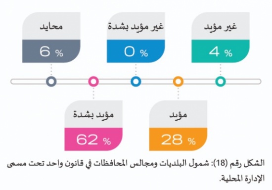 وبما يتعلق بإعادة النظر بهيكلية الوزارات على مستوى المحافظات أيد ما مجموعة 80%من المستجيبين ضرورة إعادة الهيكلة على مستوى المحافظات، فيما أيد ما نسبته 64%تضمين نظام تقسيم الدوائر الانتخابية لمجالس المحافظات داخل القانون، ووصلت نسبة الذين يؤيدون إلغاء التعيين في مجالس المحافظات إلى 73%من مجموعة المستجيبين، وطالب ما نسبته 80%من المستجيبين بوجود مقر مستقل لمجالس المحافظات.