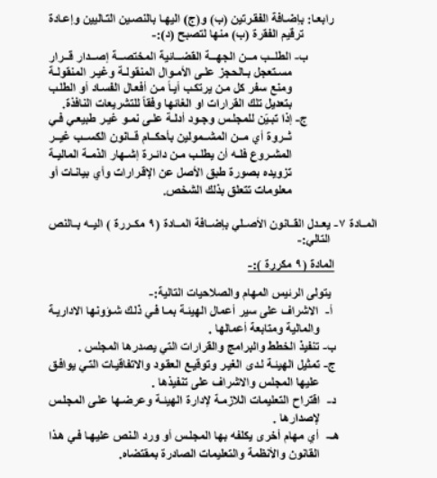 إذا تبين للمجلس وجود أدلة على نمو غير طبيعي في ثروة اي من المشمولين بأحكام قانون الكسب غير المشروع فله ان يطلب من دائرة إشهار الذمة المالية تزويده بصورة طبق الأصل عن الاقرارات واي بيانات أو معلومات تتعلق بذلك الشخص.