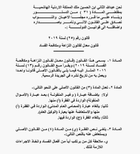 المدينة نيوز:- صدرت الارادة الملكية بالمصادقة على قانون معدل لقانون النزاهة ومكافحة الفساد. واضاف القانون المعدل العديد من الفقرات على القانون السابق، ومن ذلك الطلب من الجهة القضائية المختصة اصدار قرار مستعجل بالحجز على الأموال المنقولة وغير المنقولة ومنع سفر كل من يرتكب أياً من أفعال الفساد أو الطلب بتعديل تلك القرارات أو إلغائها.