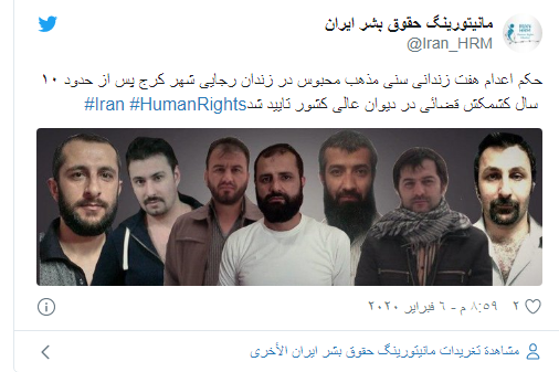 وذكرت منظمة مراقبة حقوق الإنسان في إيران في حسابها الرسمي على ”تويتر“، مساء اليوم الخميس، أن ”المحكمة العليا في إيران أيدت حكم الإعدام الصادر ضد سبعة سجناء من أبناء السنة بعد قرابة 10 سنوات من النزاع القضائي“، ولم تورد المنظمة التهم الموجهة للأشخاص.